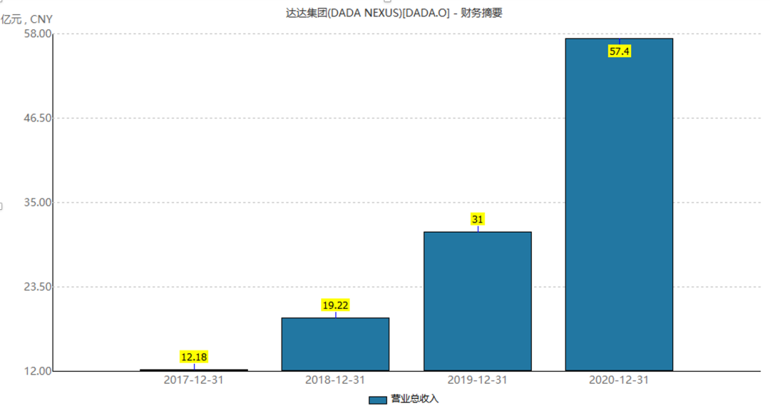 从历年财报看,达达的年营收从2017年的12.18亿元,增长到2020年的57.4亿元,几乎是保持翻倍的态势。