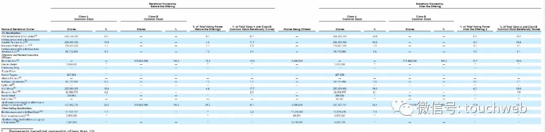 IPO后,软银有8.6%的投票权,及33.1%股权;Entities associated with Greenoaks Capital Partners, LLC有4.3%股权,及16.6%股权;