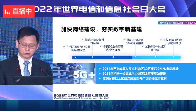 他透露,中国广电与中国移动一起,2021年已完成县乡及农村地区20万座700MHz基站建设,2022年进一步完成中心城区28万座基站建设,实现乡镇以上区域连续覆盖并广泛延伸至行政村。