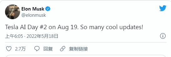 您的位置 首页 > 新浪科技 马斯克:将于8月19日举办特斯拉AI日活动 瞎采新闻 发布于 2022-05-19 评论() 阅读() 北京时间5月18日消息,特斯拉CEO埃隆·马斯克发推表示,第二届特斯拉AI日将于8月19日举行。 文章导航