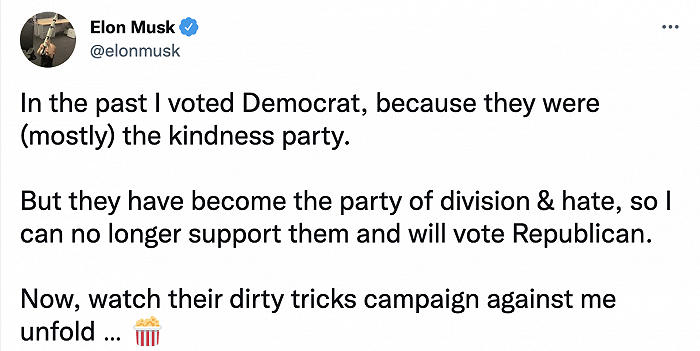 财联社5月19日电,特斯拉CEO马斯克发布推特表示:“我过去曾投票给民主党,因为他们(大部分)是好心的政党。但他们已变成分裂及仇恨的政党,因此我再也无法支持他们,将投给共和党。现在,看着他们针对我的肮脏手段展开吧。”他还在另一则推文中写到:“未来几个月针对我的政治攻击将急剧升级。”