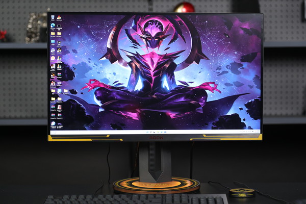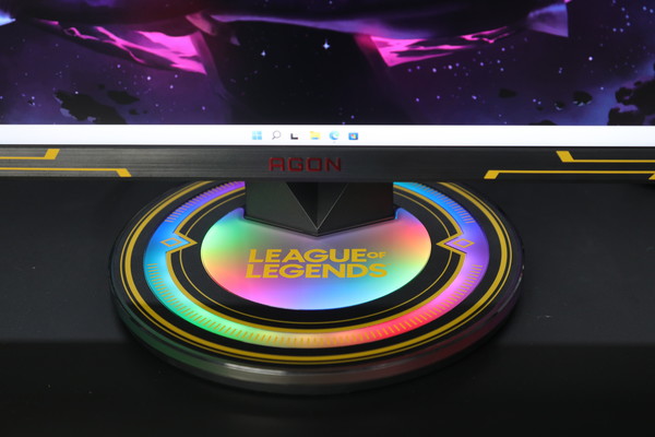 显示器正面是一块27英寸的IPS面板,采用三微边设计,较高的屏占比能为玩家提供更为沉浸感的视觉体验。在配色上,显示器主体以黑、金双色为主导,在显示器底边还带有电竞红镀铬效果的AGONLOGO点缀其中。左右两侧的金色线条元素均取自《英雄联盟》游戏中的独特边框样式。