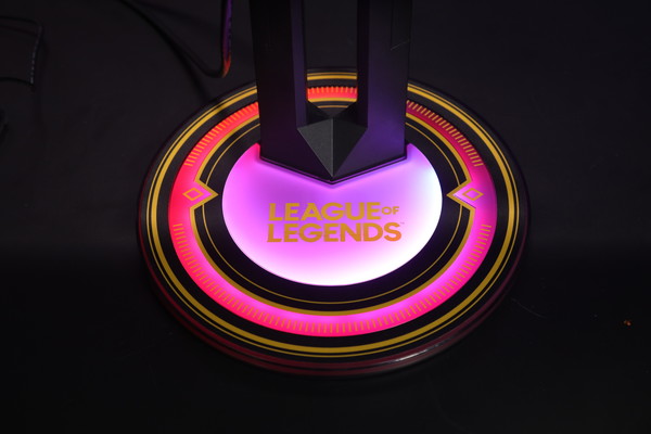 显示器支架没有采用常规的“人字”造型,而是采用圆形底座,上面印有“海克斯科技”风格条纹样式的丝印,中间还带有英雄联盟LOGO。