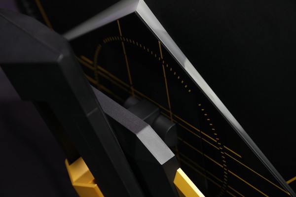 显示器支架采用快拆设计,无需工具就能轻松拆装。支架中间被设计成了中空造型,带有理线槽,能够很好地将线材“隐藏”起来。支架的金色饰片采用多边形方块设计,仿佛是一颗倒悬的金色机械心脏,与其背后的金色纹理相得益彰。这样的设计细节完美还原了《英雄联盟》的游戏元素,将神奇的游戏世界和领先的视讯科技紧密地融合在了一起。