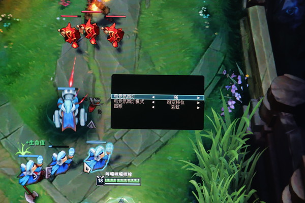 除此之外,爱攻AG275QXL还带有《英雄联盟》LightFXSync功能,配合AOC自家的G-Menu软件就能调节显示器的游戏模式、游戏同步、灯光效果、灯光同步等功能。选好之后,它就能实现灯光和游戏内的各种事件进行同步,达成不同事件时电竞氛围灯便会出现联动效果,产生灯光律动。