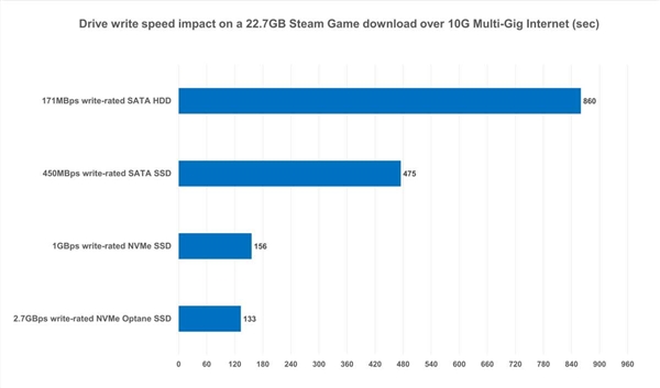 鲜明对比的是,写速2.7GB/s的Intel傲腾SSD每次都是最快完成,22GB的游戏更是2分多钟就搞定。