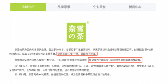 奈雪的茶官网的“品牌介绍”显示,坚持茶底4小时一换,软欧包不过夜……期望成为中国茶文化走向世界的创新者和推动者。