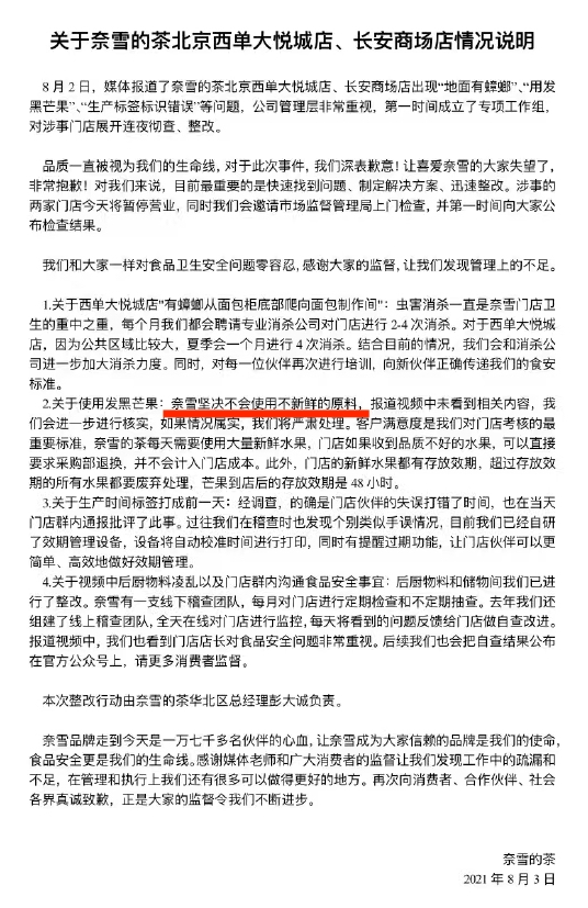 看来,食品安全这个老生常谈的问题又被奈雪的茶当成了耳旁风。还记得,去年8月,奈雪的茶就因为“地面有蟑螂”“用发黑芒果”等问题被处罚,股票也因此大跌。奈雪的茶当时发布的情况说明还表示“坚决不会使用不新鲜的原料”。