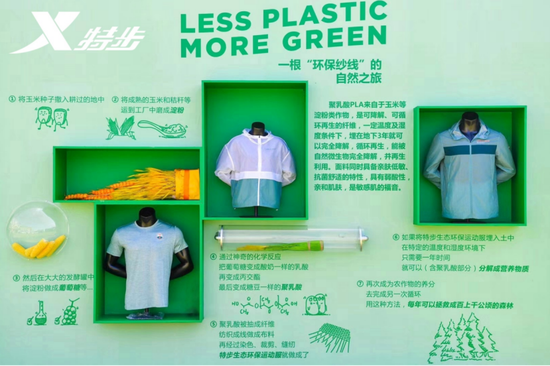 2020年,特步推出了聚乳酸风衣。这一全新材质从玉米、秸秆等含有淀粉的农作物中发酵提取而来,只要在特定温度和湿度的环境下土埋,一年内就能自然降解。