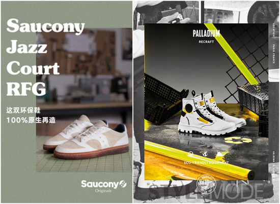 2021年,索康尼推出新鞋款Jazz Count RFG,采用棉花、黄麻、羊毛、橡胶、木材、栀子花等七种再生材质进行制作。帕拉丁也推出了多个环保材料系列,如“再利用”时尚行业丢弃碎布面料等原材料制成的RE-CRAFT系列。