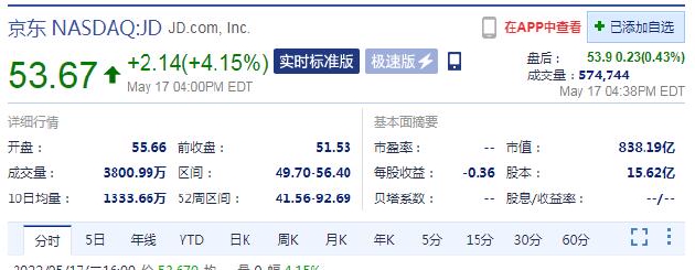 新浪科技讯 北京时间5月18日凌晨消息,美股周二收高,科技股领涨。京东收盘股价收涨4.15%,报53.67美元。