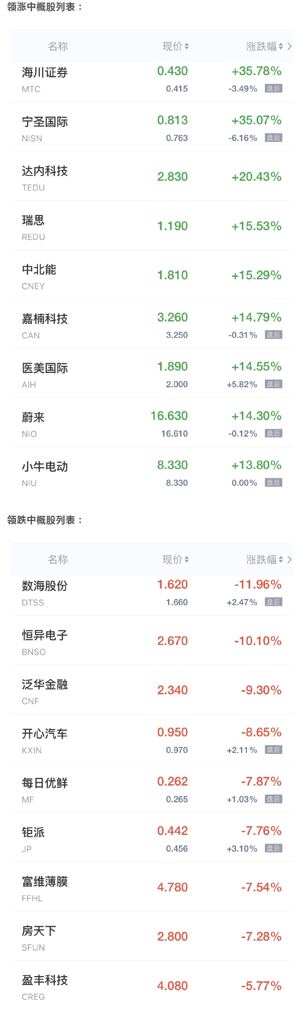 海川证券涨超35%,瑞思涨超15%,蔚来汽车、嘉楠科技涨超14%,小牛电动涨近14%,法拉第未来、第九城市、51Talk涨超13%,迅雷涨近13%,网易有道涨超12%,老虎证券、金山云涨超12%,微美全息涨超11%,理想汽车、爱奇艺、新氧、BOSS直聘涨近8%,尚德机构涨超7%,阿里巴巴、拼多多、瑞幸粉单、亿航涨超6%,小鹏汽车、陆金所控股、寺库、涂鸦智能、怪兽充电涨超5%,百度、云米科技涨近5%,京东、中通、波奇宠物涨超4%,趣头条、唯品会、携程、水滴公司、一起教育涨超3%,叮咚买菜涨近3%,哔哩哔哩、富途控股、欢聚集团、斗鱼、虎牙、高途涨超2%,新东方、知乎涨近2%,微博、网易、贝壳、万物新生、满帮涨超1%。
