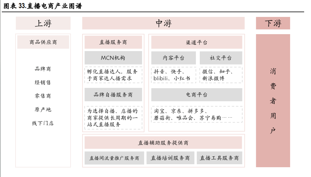 产业链发展完善,渠道平台占据重要位臵。上游的商品供应商、中游的直播服务商、直播辅助服务 提供商、渠道平台以及下游的用户构成了直播产业链的五要素,共同完成从商品供应、达人/商家直 播到用户购买消费的转化。产业链完善度不断提高,渠道平台的核心位臵凸显。(报告来源:未来智库)