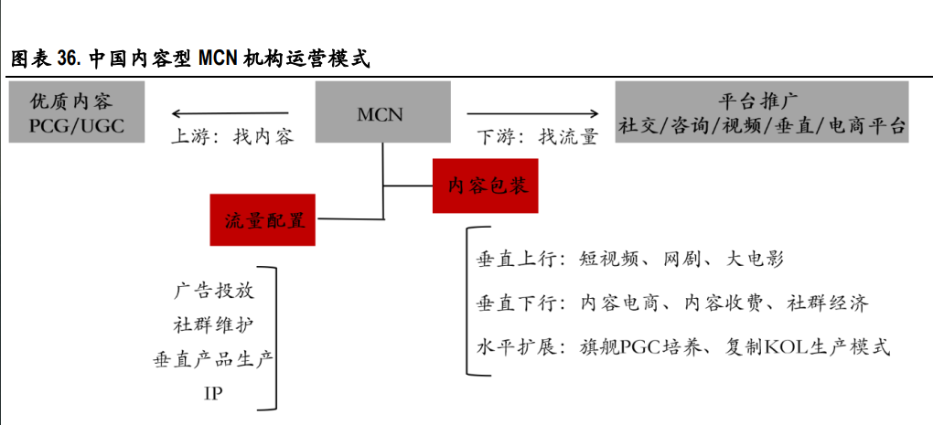 内容型 MCN 机构位于产业链中游,它向上整合产业链上游内容资源,向下拓宽内容分发渠道,是链接上下游的枢纽,使得内容创作者与平台方沟通更加高效。MCN 机构需要具备两大基本能力:1)对 创作者的内容输出形式进行包装,以吸引更多的受众,为商业变现提供基础;2)流量配臵,提高红 人或者机构本身的影响力,并通过精准推介提升流量的变现能力。在具体运作过程中,MCN 机构首 先需要寻求优质 PGC/UGC 内容创作者,再对不同类型的网红进行定制化专业技能培训,为网红提供 商业化服务,针对性引流增加曝光机会。