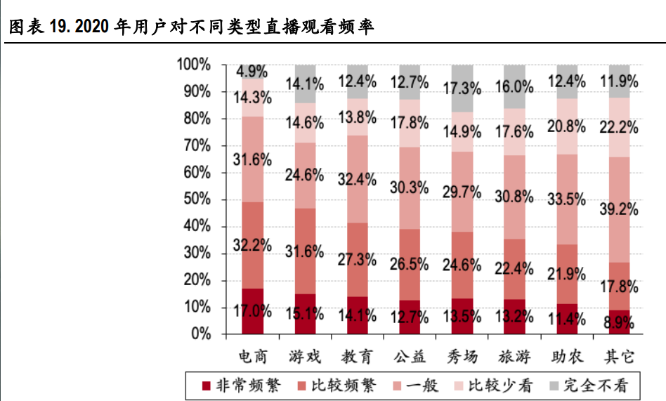 游戏和泛娱乐直播发展较早,已进入增长缓慢的阶段;电商直播近年来高速发展,是目前直播观看 频率最高的品类;教育、知识分享、旅游等垂直品类直播依托于垂直内容平台发展。