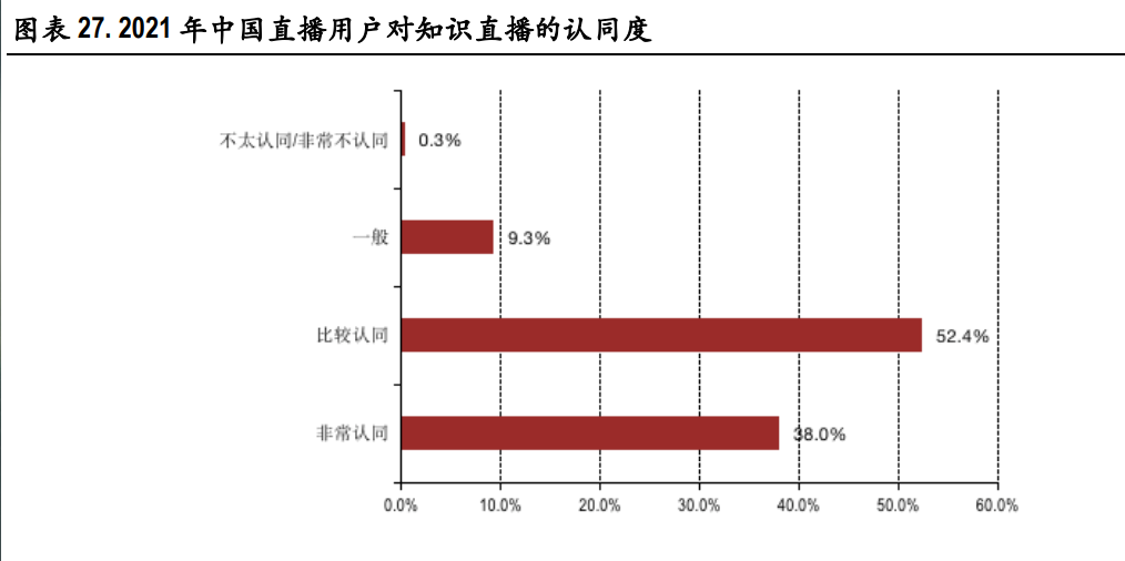 知识直播更新了传统的文字资料阅读和线下面对面传授的获取途径,通过在线直播向平台用户推送 知识或经验,同时与用户进行实时交流与反馈,在拓展受众群体范围、提升双向交流效率、增强场 景趣味性等方面优势明显,知识直播正成为在线直播行业图谱的重要组成部分。 满足用户超越娱乐的知识价值需求,认可度高。知识直播具备专业知识、技能的价值沉淀,为平台 丰富了垂类内容,挖掘并满足用户超越娱乐的求知需求。用户对知识直播存有高认可度,2021 年超 过 90%用户认可知识直播,其中 38%持非常认同态度。 通过直播这一新颖的知识传播场景,加上平台原有的社区互动氛围,不仅是对该领域有强学习目的 性的用户会加入直播,还会吸引即时发生兴趣的观众,不断拓展原有受众群体,实现破圈。这都将 提高平台用户粘性,沉淀用户价值。