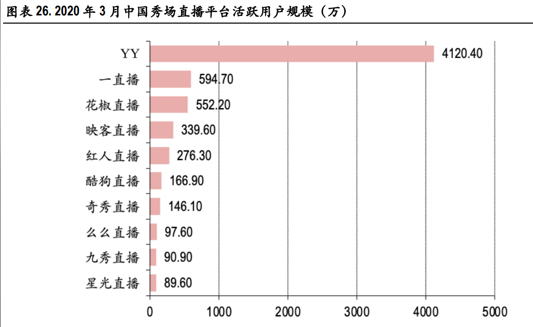传统秀场直播的格局较为稳定,以 YY 直播、映客直播、花椒直播为头部玩家,斗鱼虎牙等以游戏直 播为主的平台的秀场直播业务亦具备竞争力,同时各短视频平台也提供了大量较为同质化的内容。