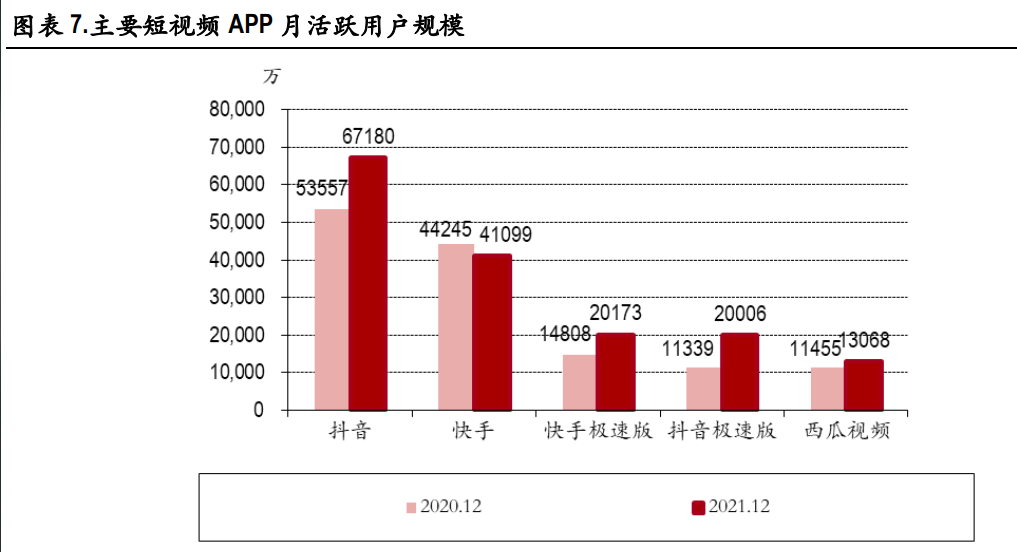 根据 QuestMobile 的数据统计,2021 年 12月抖音、快手两大短视频平台月活量分别为 6.72 亿、4.11 亿, 其余排名前 5 的同类 APP 也均隶属于快手系或字节系,短视频行业的双寡头格局已经确立。短视频 平台同时具有社交和内容属性,头部效应强于长视频、游戏等其他内容形态,但弱于社交、通讯平 台,因此我们认为双寡头格局还将持续。而微信视频号,我们更倾向认为它是丰富微信内容形态、 探索变现空间的新模块,由于强熟人社交属性,以及在内容运营方面并不激进,我们认为中短期内 视频号难以撼动抖音和快手的地位。